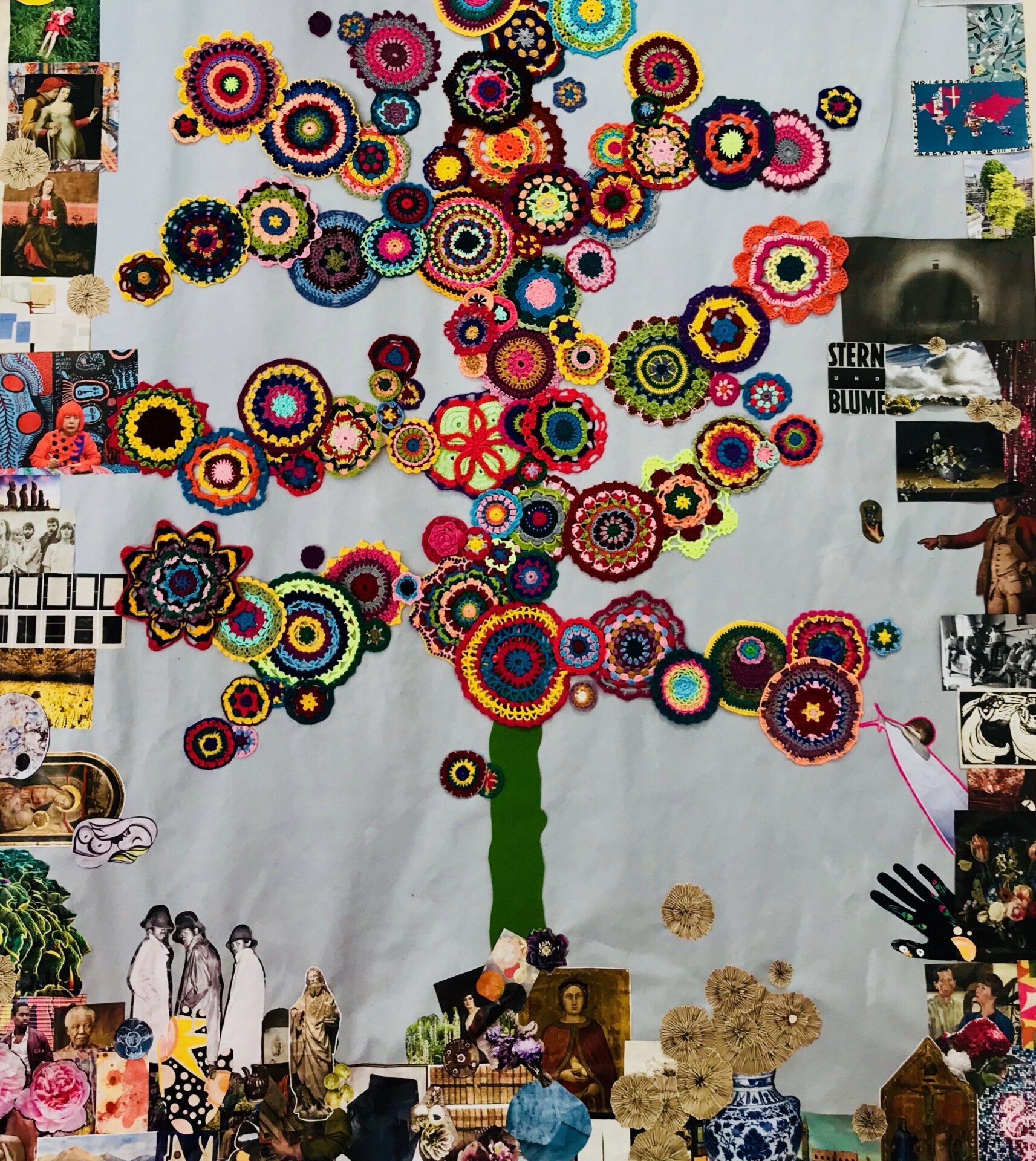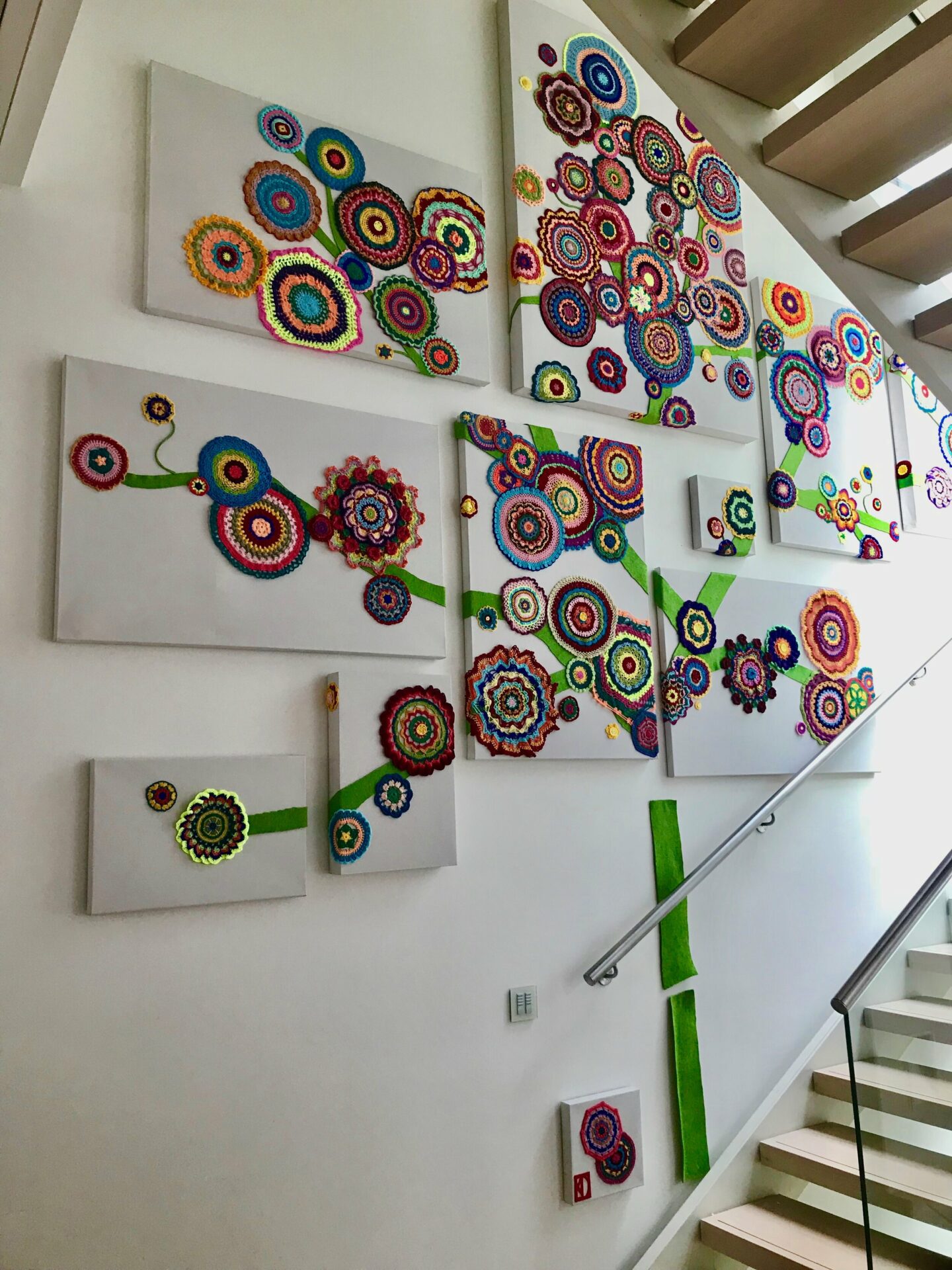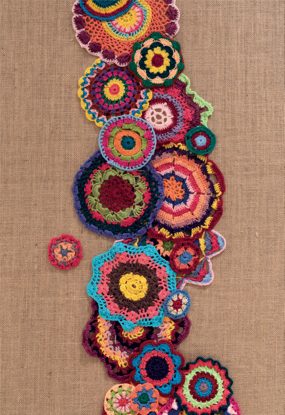 The crochet doilies were made by internally displaced women in Syria, providing a revenue for them. The words are those of refugees, diplomats, aid workers, medical staff and soldiers involved in the refugee crisis. Around the black base are conditions for being defined as a refugee by the UN 1951 Convention for Refugees.