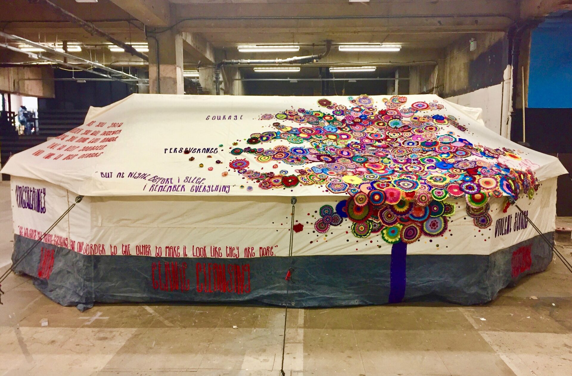 Am I My Brother’s Keeper? by Kate Daudy was a large scale installation piece made out of a used UNHCR tent, lived in by a family of Syrians in 2015. The father of the family wrote his name in biro over the front door – Abu Teim.